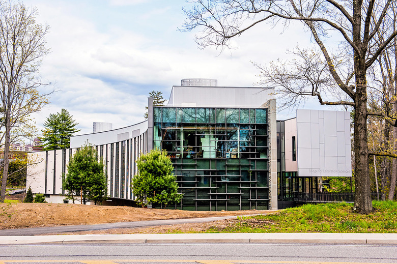 While the frits on the northwest elevation also aid in filtering the hot afternoon sun, architect and client opted for unobstructed vision glass on the short north and south facades and the curving southeast elevation. The east side of the building is also where the long, light-filled corridor – coined "The Gosway" after an alumnus donor – is located, connecting the building entrances and acting as the conduit stitching the north and south sides of campus. Vertical fins on the exterior filter some of the light, but the clear glass allows for views of the creek and a historic campus building to the south.