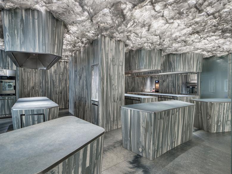Enigma features an open kitchen, where sintered stone covers just about every surface to create an otherworldly feeling.