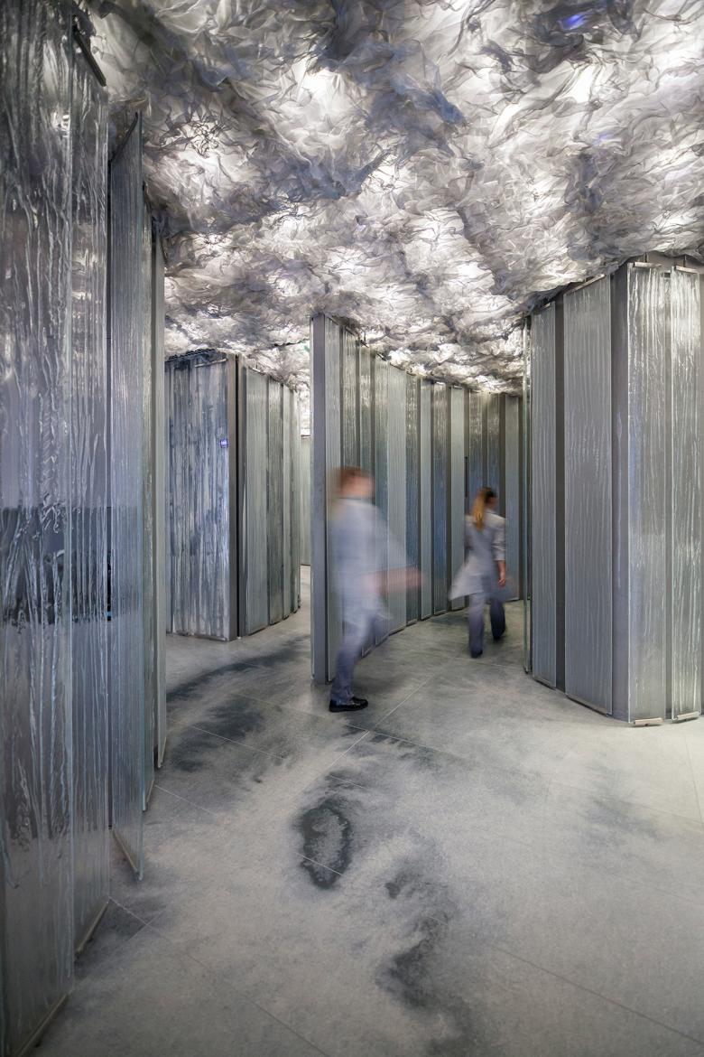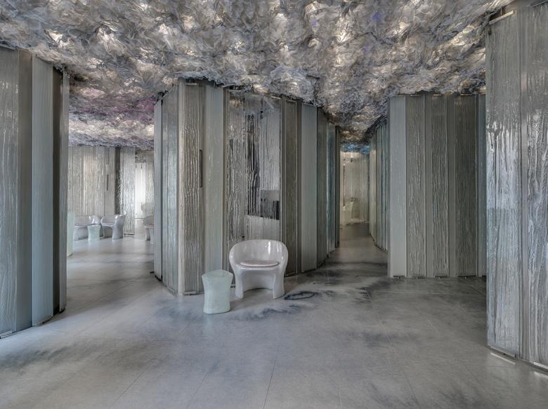 The designers used "the cloud" as a concept for the space; it finds reality in the illuminated ceiling, the glass walls, and the sintered stone surfaces.