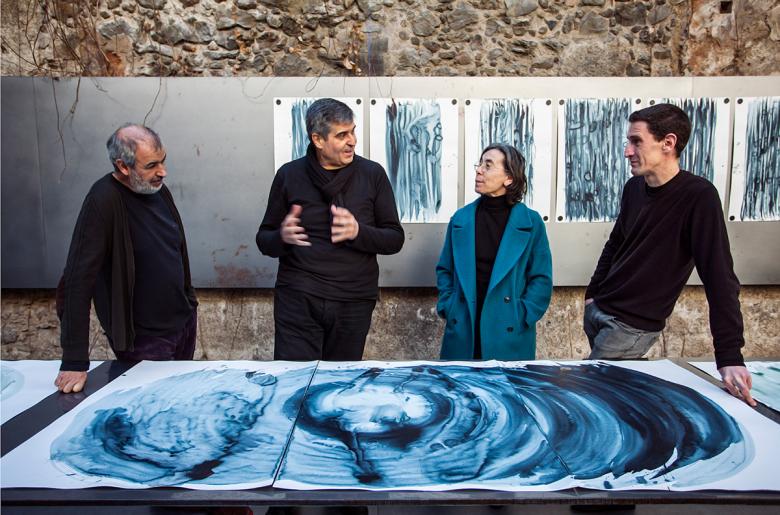 The designers standing over the original watercolor. Left to right: RCR's Ramón Vilalta, Rafael Aranda, and Carme Pigem; Pau Llimona.