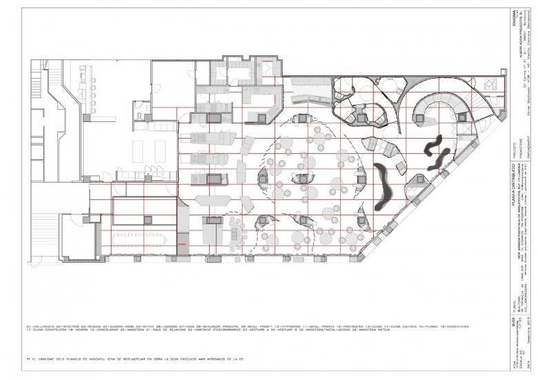 Floor plan with entrance from the street at top-right, open kitchen at left, and dining spaces amongst the forest of columns in between. (Drawing: RCR Arquitectes/Pau Llimona)