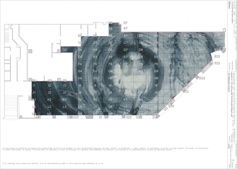 The designers started with the site they were given: a raw ground floor space in a corner office building northeast of Plaça d'Espanya. Confronted with a grid of structural columns in the space, the designers objective was to "transform this industrial space into a flowing, evanescent, profound and timeless landscape so people can disconnect from the world around us and be taken away to Albert’s world of creativity." The building's walls and columns were covered in translucent textured glass to demarcate the route for the diners but also to conceal these elements. These icy glass walls, the cloud-like metal mesh ceiling, and the sintered stone flooring work together to create the immersive environment aligned with Adrià's innovative menu.