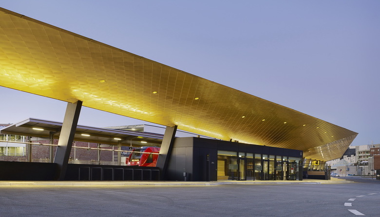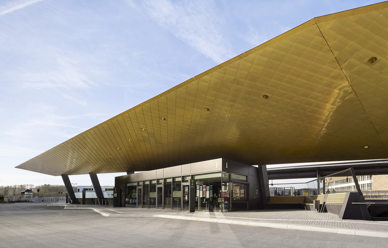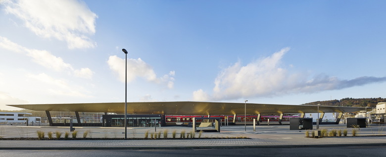 Gummersbach's old train station was demolished as part of the plan, and the bus station was relocated here. For this new location pape + pape designed a 130-meter-long, 10-to-25-meter-wide roof whose form and materials are a worthy prelude to those entering the city. It follows the gentle curve of the train platform and consists of a polygonal folded form inspired by the broken structure of rocks in the area. Aluminum bronze shingles on the underside of the roof shine golden, an effect strengthened by the darkness of the concrete base and the angled concrete columns supporting the roof.