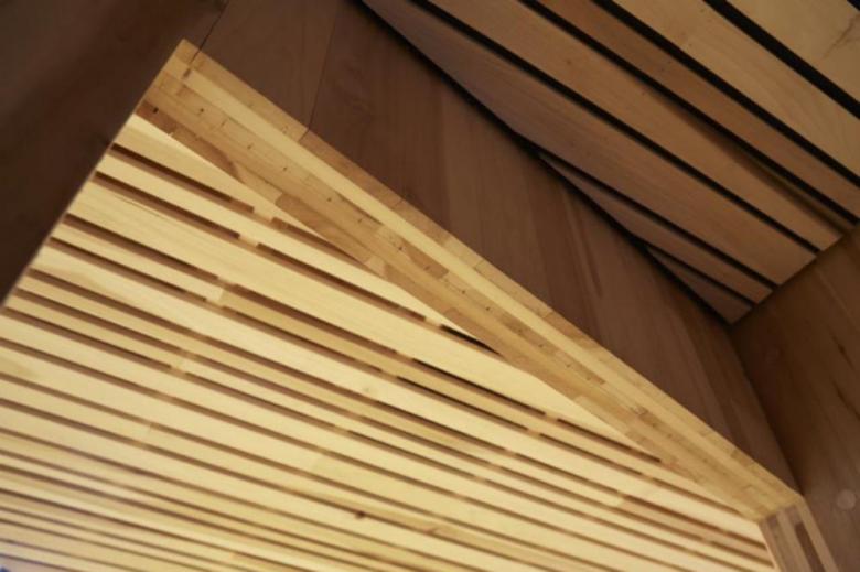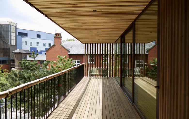 Maggie's Oldham is made with 27.6 cubic meters of American Tulipwood and 1.1 cubic meters of Ash. These woods were made into twenty prefabricated elements of five-layered plywood CLT with lengths between 0.5 and 12 meters, a thickness of 10cm, and a height of 2.93m. The exterior woods on the facade and balcony were thermally treated: dried at 200°C without oxygen to increase the dimensional stability and durability. Inside, the wood reportedly creates an ambiance that lowers the blood pressure and the pulse and thus the recovery time. According to the 2015 report Wood Housing, Health, Humanity from Planet Ark, wood has a greater benefit to health and well-being than any other building material.