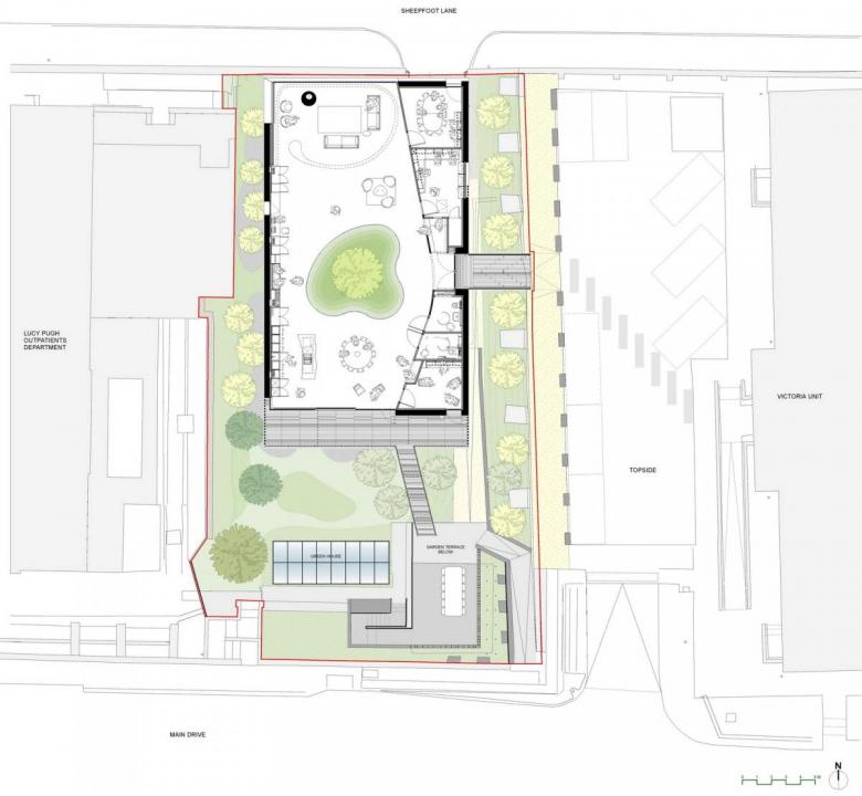 Maggie's Oldham is built on the grounds of the Royal Oldham Hospital, a complex of several smaller and larger buildings. Round steel supports, up to four meters high, support the one-story building, in order to address the site's level changes and give the whole a certain lightness. At the same time, the ground is preserved for a garden that can be freely used. The themes of nature and the garden are found throughou, not only on the outside. Openings in the floor and roof allow a tree to pass through the building, presenting it as a sculpture.