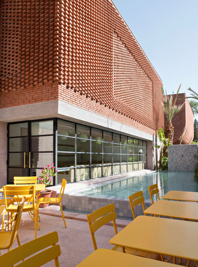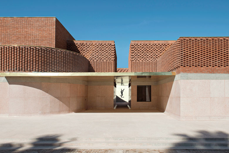 According to the museum's website, French architects Karl Fournier and Olivier Marty of Studio KO "became intrigued by the duality between curved and straight lines, and between loose and precise approaches to cutting fabric" while digging through Saint Laurent's archives. Therefore, "The facade of the building appears as an intersection of cubes with a lace-like covering of bricks, creating patterns that recall the weft and warp of fabric." The terracotta bricks, oriented flat and turned 90 degrees, were locally produced, further giving the building a certain Marrakesch flavor.