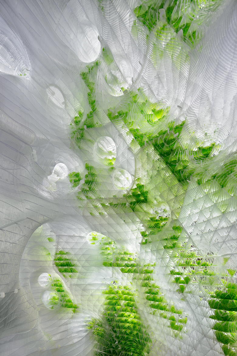 [In Hortus] a digital algorithm simulates the growth of a substratum inspired by coral morphology. This is physically deposited by 3D printing machines in layers of 400 microns, supported by triangular units of 46 mm and divided into hexagonal blocks of 18.5 cm. Photosynthetic cyanobacteria are inoculated on a biogel medium into the individual triangular cells, or bio-pixel, forming the units of biological intelligence of the system. Their metabolisms, powered by photosynthesis, convert radiation into actual oxygen and biomass. The density-value of each bio-pixel is digitally computed in order to optimally arrange the photosynthetic organisms along iso-surfaces of increased incoming radiation. Among the oldest organisms on Earth, cyanobacteria's unique biological intelligence is gathered as part of a new form of bio-digital architecture.