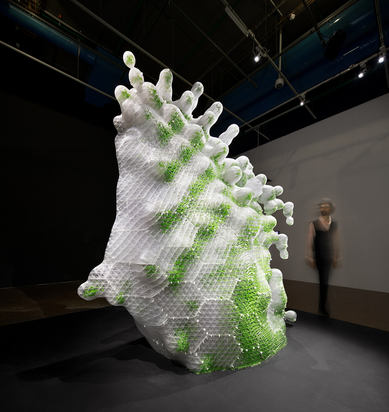 H.O.R.T.U.S. XL Astaxanthin.g is one of two sculptures by London's ecoLogicStudio that is on display in La fabrique du vivant at the Centre Pompidou in Paris. H.O.R.T.U.S. XL Astaxanthin.gHortus for short – is a "collaboration" with colonies of photosynthetic cyanobacteria, while the other piece, XenoDerma, was created with a collective of Asian Fawn Tarantula, making it reminiscent of Tomás Saraceno's "cosmic webs." Hortus, the focus here, is particularly impressive, given its size, the way visitors can move inside it, and the potential applications of its bio-technology.