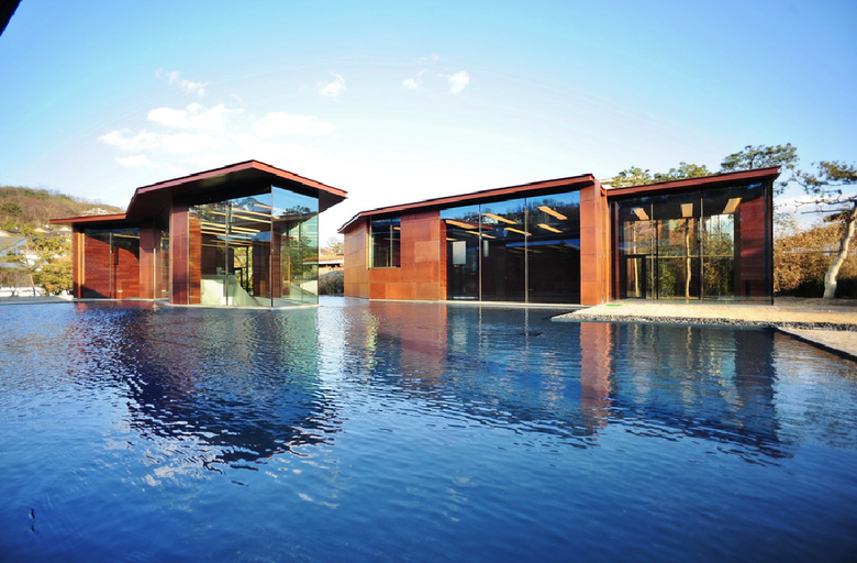 A pool of water connects the top floor of the three pavilions as an ensemble. The smallest pavilion acts as the entrance to the gallery. Photo: In ho Lee