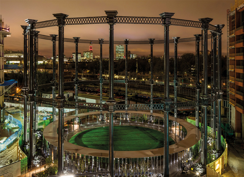 Gasholder No.8 was built in the 1850s, expanded in the 1880s, and then decommissioned in 2000. Designed to store gas for the Pancras Gasworks, the frame was made from 16 hollow cast iron columns in two levels that were joined by wrought iron lattice girders. At 25 meters high and 35 meters in diameter, it is a large structure, but one that has a human scale thanks to the Victorian details. After the Grade II listed structure was decommissioned, it was dismantled, refurbished, and then rebuilt on the north side of Regent's Canal. It serves as a park and event space following Bell Phillips Architects' 2008 competition-winning design, which placed a circular lawn and stainless steel colonnade within the old structure.