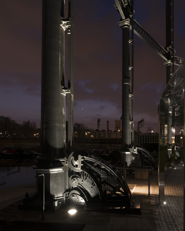 Speirs + Major, which master planned the lighting scheme for the whole King's Cross development, was responsible for the lighting of both the old gasholder structure and the new intervention. According to designer Philip Rose:
