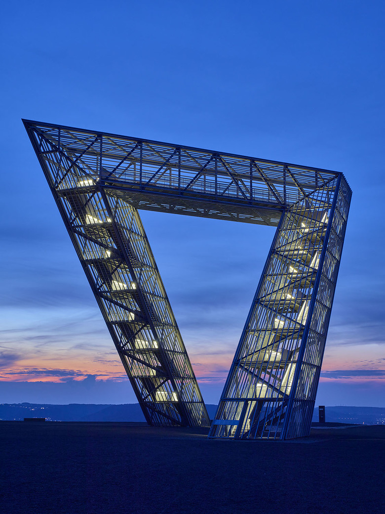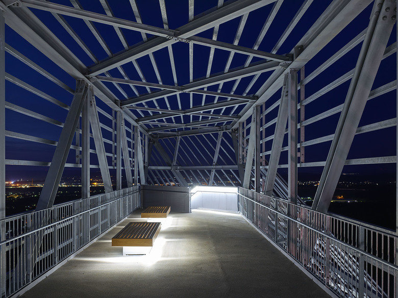 As described in a Building of the Week feature at German-Architects, the architects wanted their competition-winning design to express the change from mining to post-mining while also referring directly to mining operations. Therefore steel was the obvious choice for the structure, which is made up of two stairs connected by an overhead walkway that create a sharp-lined "S" in plan.