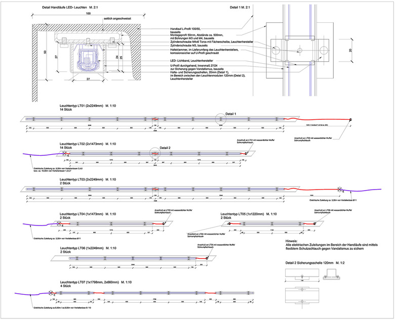 Lichtvision's lighting design is an invitation to climb up to the lookout, where the intensity of the illumination was lowered to shift the focus to the view. Here, LEDs are found at the underside of the benches, hidden like the lines of lights at the stairs. Considerations of low maintenance, simple installation, minimal cabling, protection from the elements and reduction of plugged components went into Lichtvision's design and led them to Insta's LEDLUX linear light. As installed the fixtures disappear, leaving the light they produce as – alongside the steel – one of the sculpture's two primary "materials."