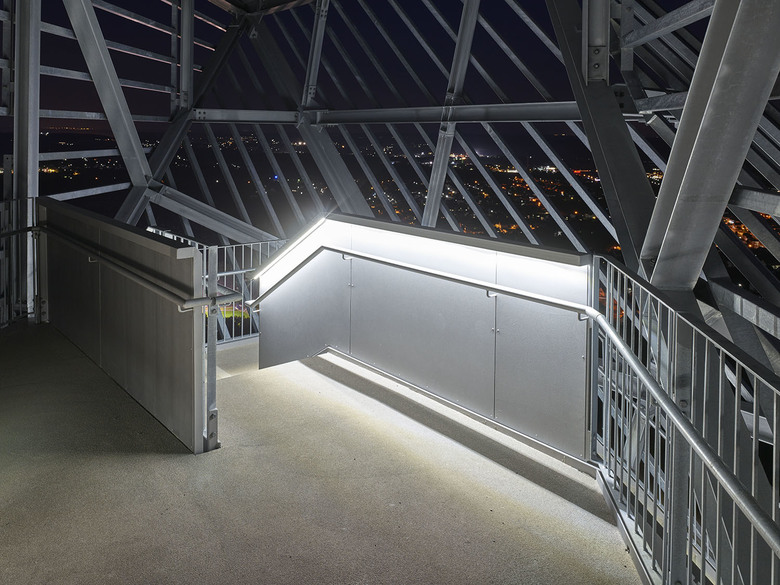 According to Lichtvision, "While at daytime the pure outer form of the landmark dominates, the inner geometry of the passage emerges at night thanks to the lighting." Lines of LED are recessed at the top of the solid balustrades, shining down to illuminate the walking surfaces of the stairs and landings. Yet by casting a fairly even glow upon the steel guardrails, the LEDs "paint" staggered lines of white light that ascend and descend the sculpture's diagonal supports.