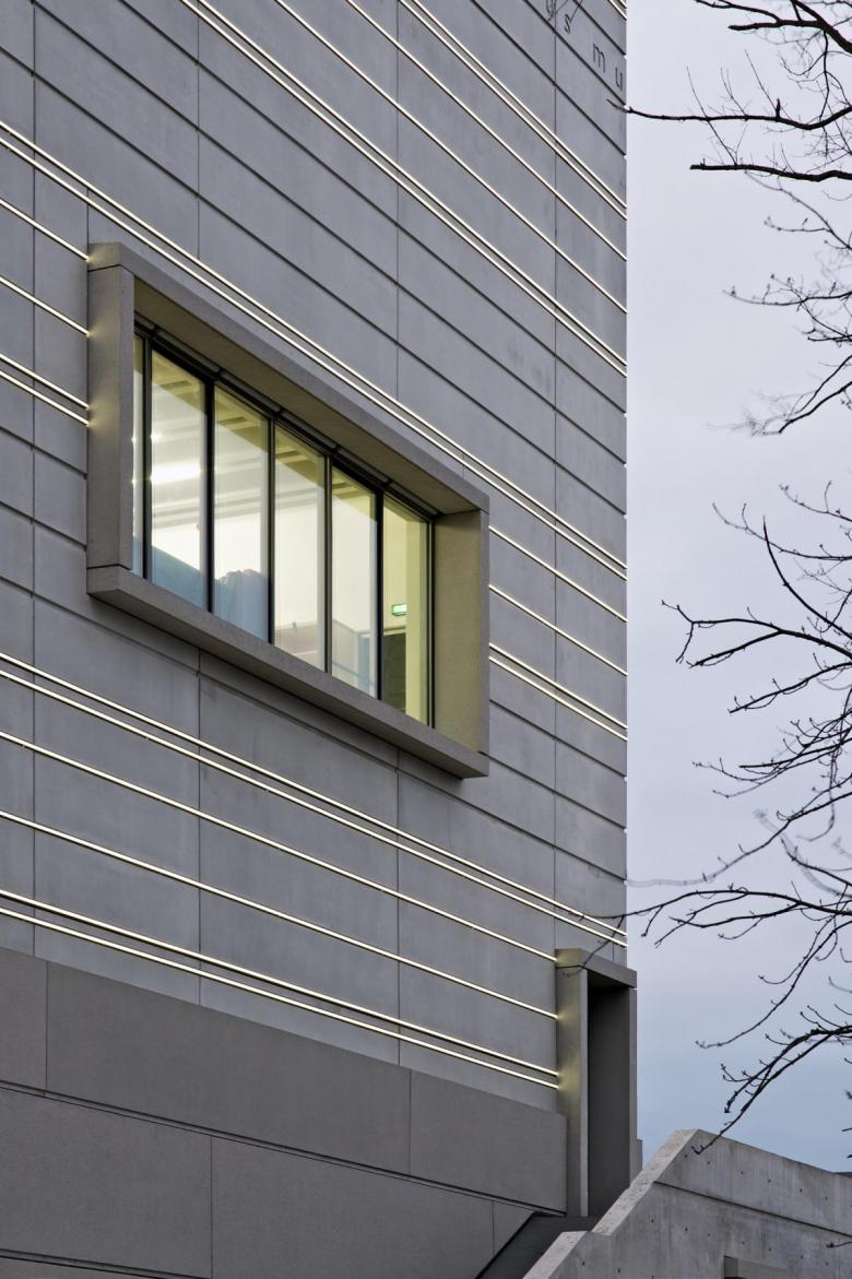 In the end, the facade being made of concrete was due to the construction schedule and construction costs. The museum was originally budgeted at 23 million Euros but eventually ended up costing 27 million Euros. This escalation led to a concrete facade, but not exposed in-situ concrete. Instead, the exterior is made of pre-stacked, rear-ventilated precast concrete hung on the cast-in-place concrete walls. Hanada approached the engineers at Hemmerlein, concrete specialists from Bodenwöhr, to develop parts with two standard widths, three different heights and a constant depth of 20 centimeters. The precast concrete contains 50 percent white cement, giving an appearance the architect is satisfied with: the fine, almost polished concrete stands in contrast to the base, parapet, and entry portals that are all sandblasted concrete.