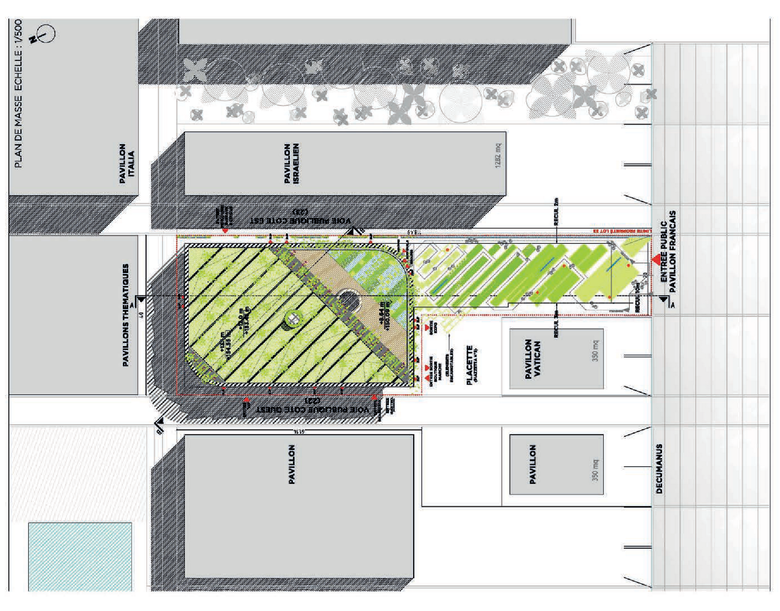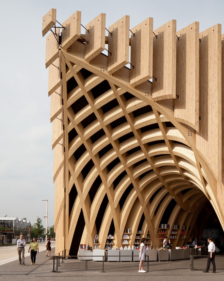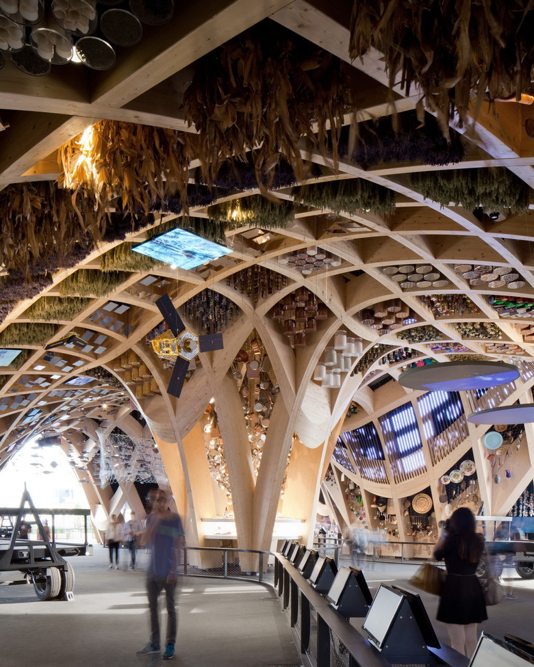 Inside, the organic shape of the roof displays the second conceptual idea: a grid-like structure made of glulam (French spruce inside and Larch outside) that creates an overhead topography symbolizing the agricultural landscape of France. The architects wanted to point out that France, despite its progress, is still a traditionally an agricultural nation, a land with great geological diversity. The construction consisted of more than 2,000 individual parts fitted together in a manner so there was no sticky residue after dismantling, and so the materials can be assembled again in the future.