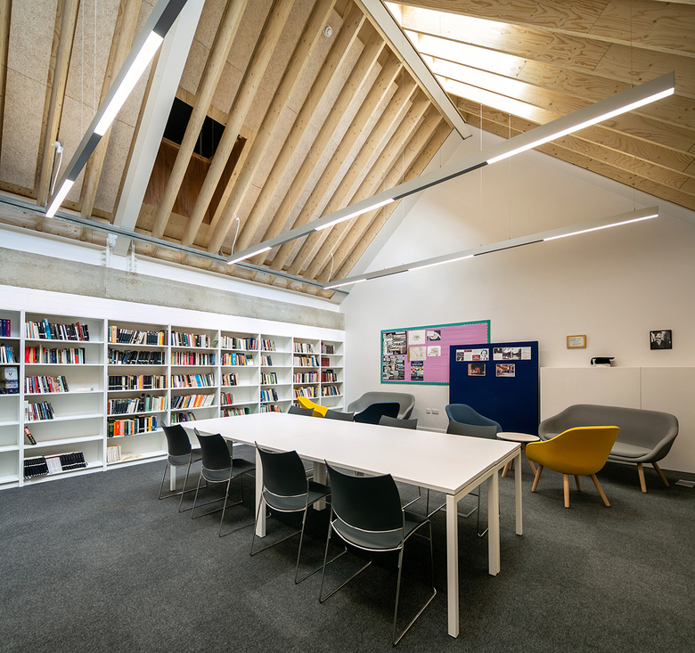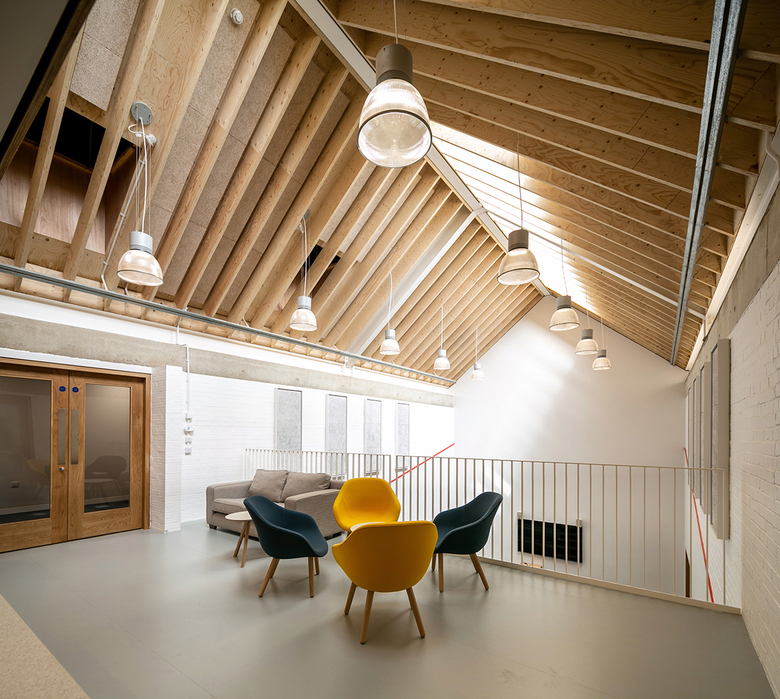 Jack Stephenson, architect at Allies and Morrison, describes the decision to use wood: "Timber is used extensively in this project and is inherent in its design concept. The structural timber is exposed to view throughout, providing maintenance-free soffits that give character and warmth to the building’s spaces." That warmth is expressed in the finished photography of the spaces beneath the wood gable roofs.