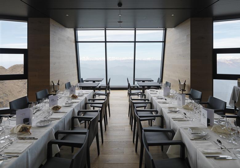 Although the gray stone, quarried from nearby Lodrino, draws the most attention, the use of glass – 400m2 (4,300 sf) in total – is also important to the design of "Fiore di Pietra." In addition to the angled glass walls atop the petals, there are recessed vertical strips of glass between the petals, storefront glazing at the building entry, and interior glazed partitions. The glass facades (Jansen VISS steel system) ensure generous views from the restaurant, but they also provide thermal and acoustical insulation, and in the winter they take advantage of passive solar heating, important in this climate and at this height. Inside, where stone surfaces give way to wood, the glass partitions (VISS Fire and Janisol 2 EI30) allow for visibility between spaces but also provide the necessary fire separation.