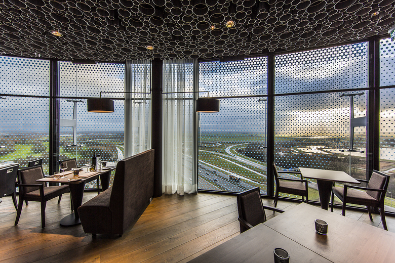 The hotel rooms look out through round windows of the inner layer and the screenprinted dot pattern of the outer layer. Given the location of the hotel near the A2 highway, the double layer serves to mitigate the sound of traffic. The restaurant and lounge are defined by full-height glazing on both layers. The larger and denser pattern printed on the outer layer helps to cut down on direct sunlight, yet guests can still enjoy panoramic views—albeit filtered ones—from the top of the building.
