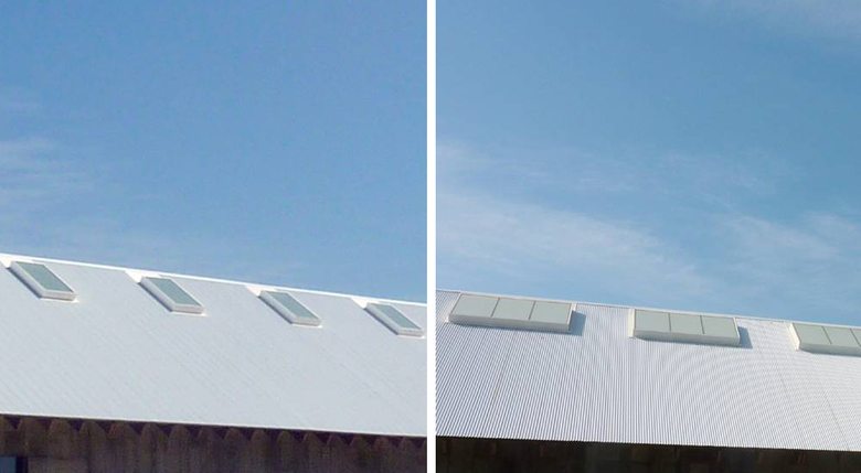 Skylights at the Parrish Art Museum face both north and south; the former are clusters of three skylights with the ClearShade product, while the latter are single conventional skylights incorporating a translucent film. Fluorescent lights with dimming ballasts are mounted in two strips below each set of skylights, controlled by the staff to step up the output of the lighting when needed. On sunny days these strips are turned off, but when World-Architects visited on a rainy day in late 2012 the lights were on to help achieve the desired 20-25 footcandles for the paintings on display.