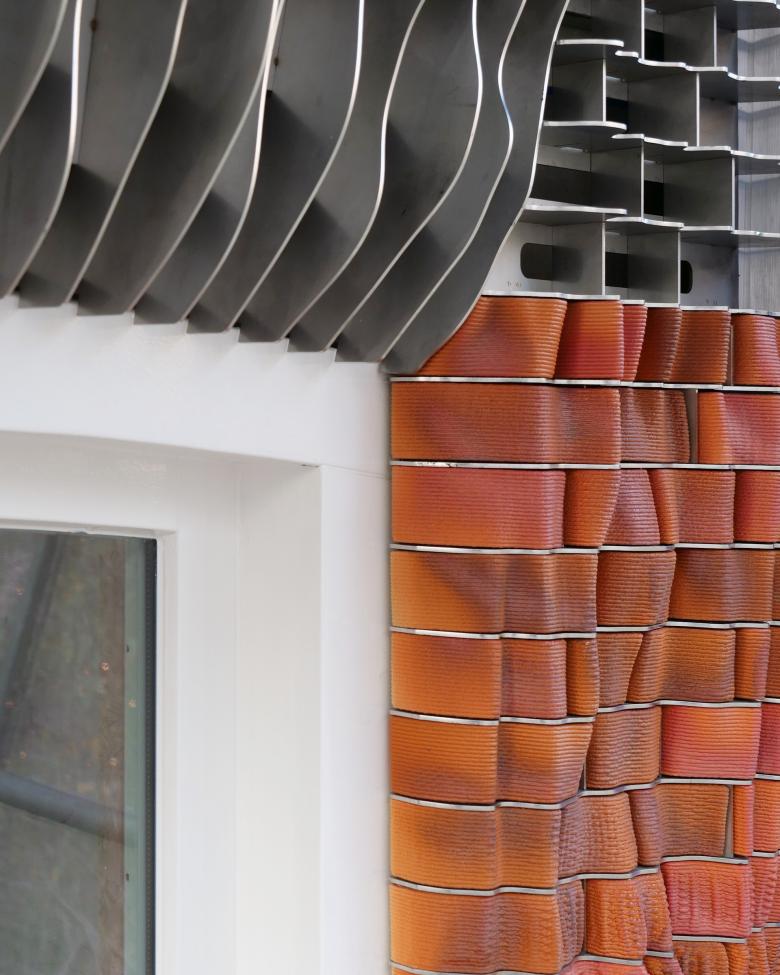 Studio RAP retained the silhouette and tripartite structure of the existing facade to maintain the basic character of the building and the way it fits in with its neighbors on PC Hooftstraat. Passersby might not even notice the building with just a quick glance, but a closer look reveals the atypical, undulating character of the masonry. The retail storefront and entrance to the upper floors are framed in white glazed 3D-printed tiles. The masonry facade on the upper floors is made from 3D-printed bricks glazed in three distinct shades of red. While the storefront tiles fade from smooth to complex as they rise vertically, the rippling texture of the bricks fades from complex on the first floor to flat on the second, as evidenced by the two photos below.