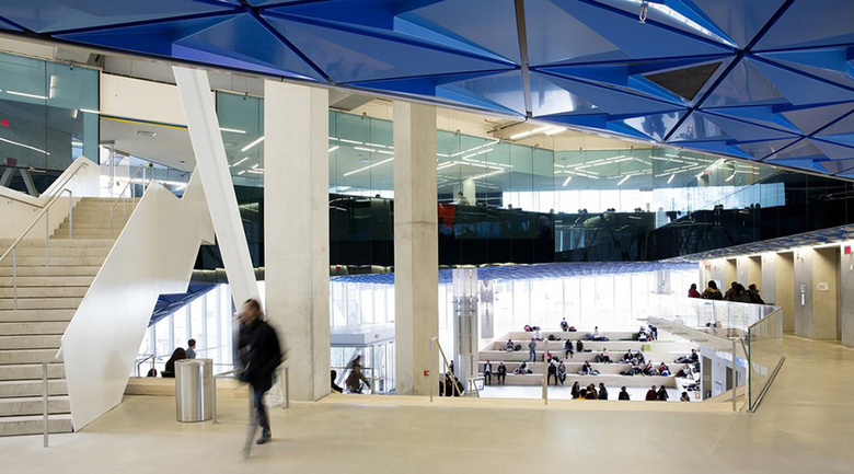 The new 8-story building expands the University's library and links to it via a bridge, while the Student Centre also includes includes academic, study and collaborative spaces for students and faculty, and ground level shops in a nod to its location in the city. Overall the building appears gem-like; it is a glass box with its corners apparently fractured off, an effect enhanced by the faceted pattern applied to the glass that wraps the building. At the corner entrance the glass gives way to the aluminum-composite panels with a prismatic blue coating.