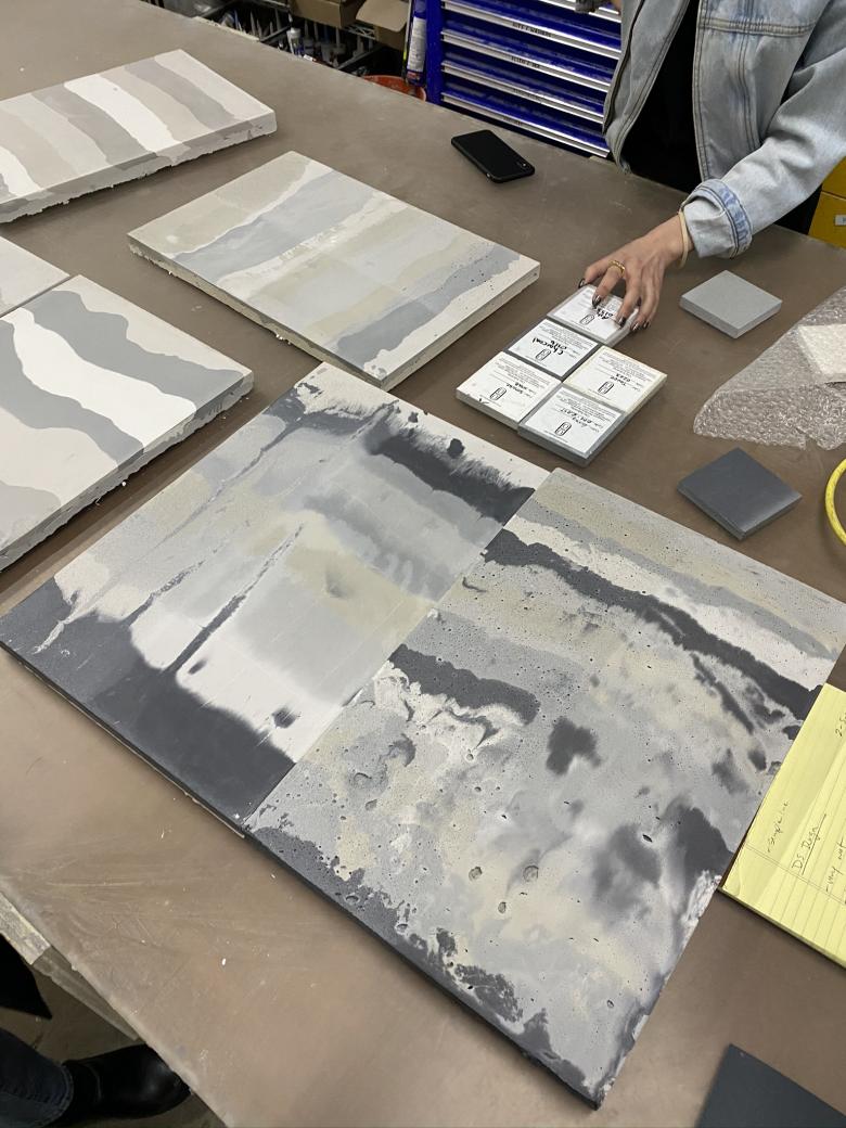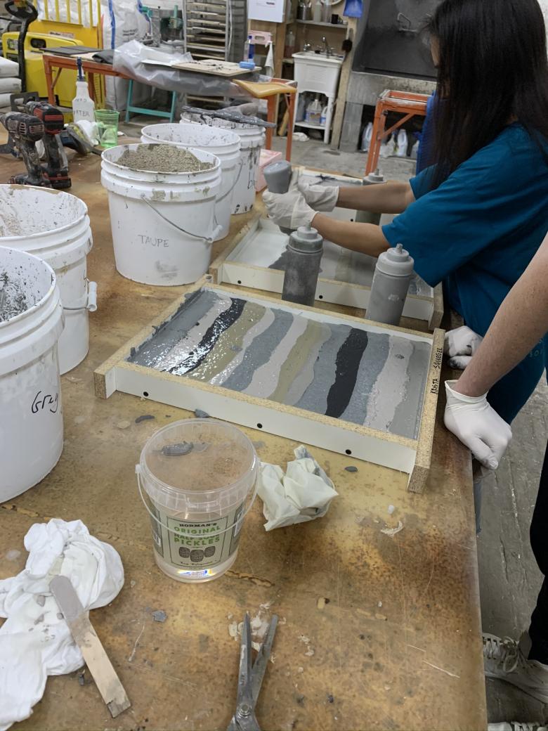 The concrete colors and the composition of their layers were tested in the shop of Oso Industries. (Photo courtesy of D.S. & Durga)