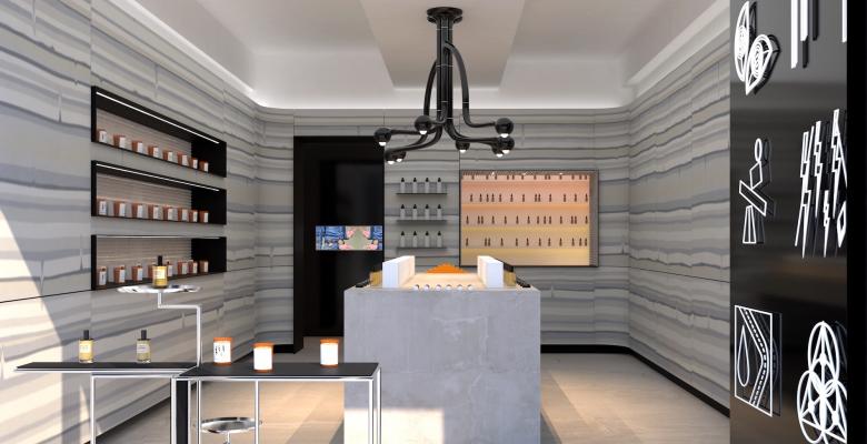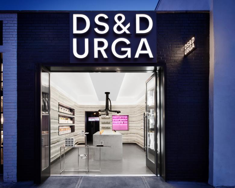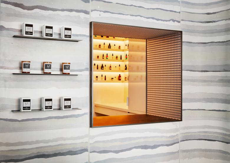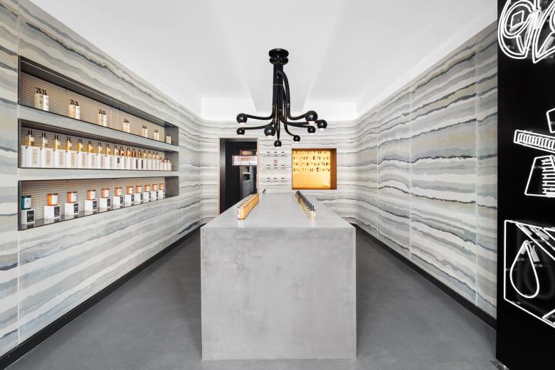 The Williamsburg outpost occupies a one-story building with a simple exterior: black painted brick, illuminated signage, and a folding wall that slides open to reveal the bespoke interior. The main space has wares displayed on two tables — one custom concrete and one a classic of early modernism — and on shelves set into one of the walls. A window at the back reveals a small atelier where D.S. & Durga's scents are developed. Tying the whole together are the striated walls that wrap three sides of the small store.