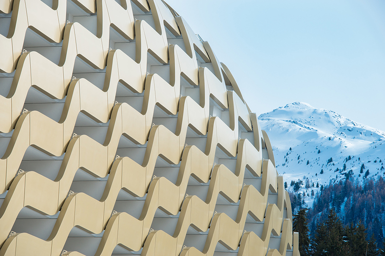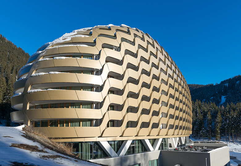 The new InerContinental Davos Hotel stands out in its mountain setting thanks to its oval form and the flowing gold façade. Munich's OIKIOS looked to the natural setting, particularly pine cones, in their design of the building, which was realized with Seele.