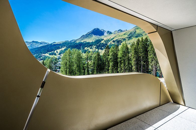 While the flowing spandrels accentuate the unique oval form, they also create distinctive portals for each room. Parallelograms with curving edges frame the mountain views from the terraces, which allow hotel guests to actually touch the steel that is the product of human creativity and computer technology.