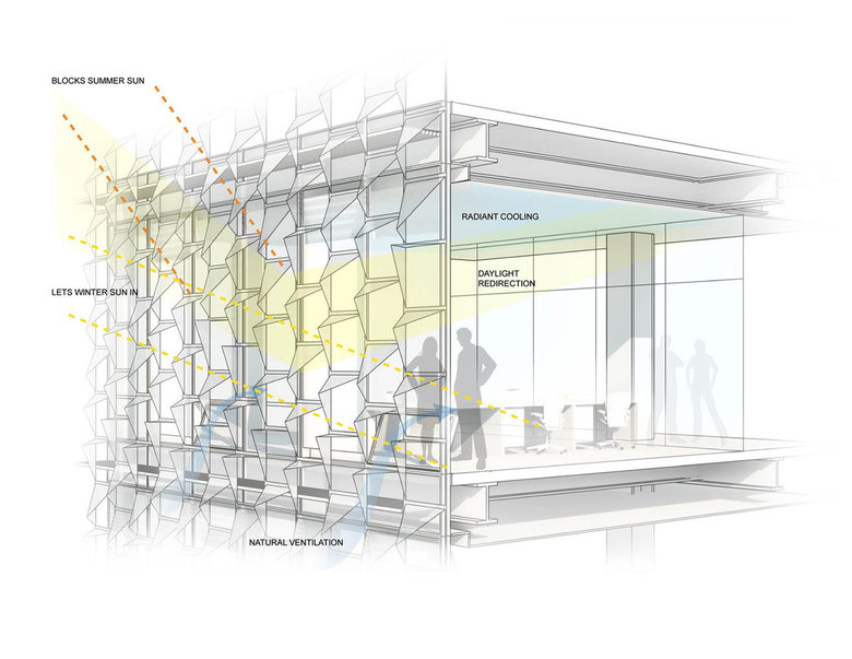 Harvard: Facade diagram illustrating how it blocks summer sun, allows the passage of winter sun, and enables natural ventilation. (Drawing: Behnisch Architekten)