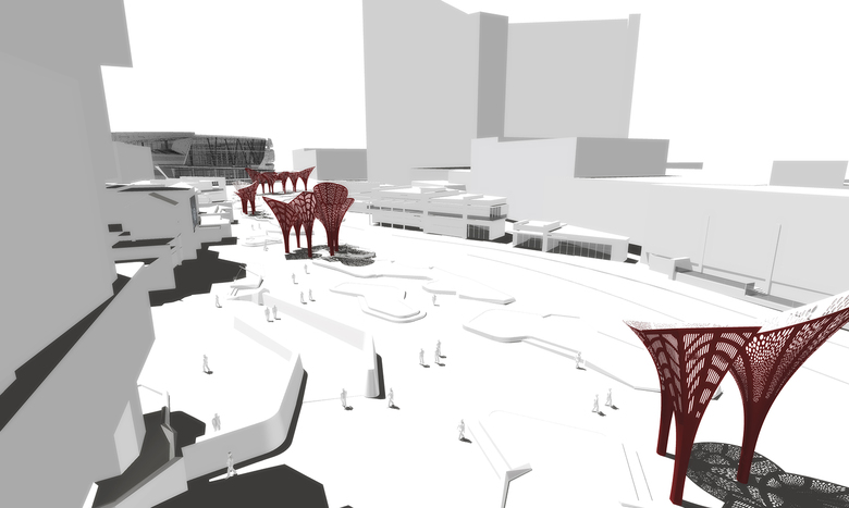 A rendering illustrating the distribution of the clumps of shade structures across the 5-acre park (Image: !melk)