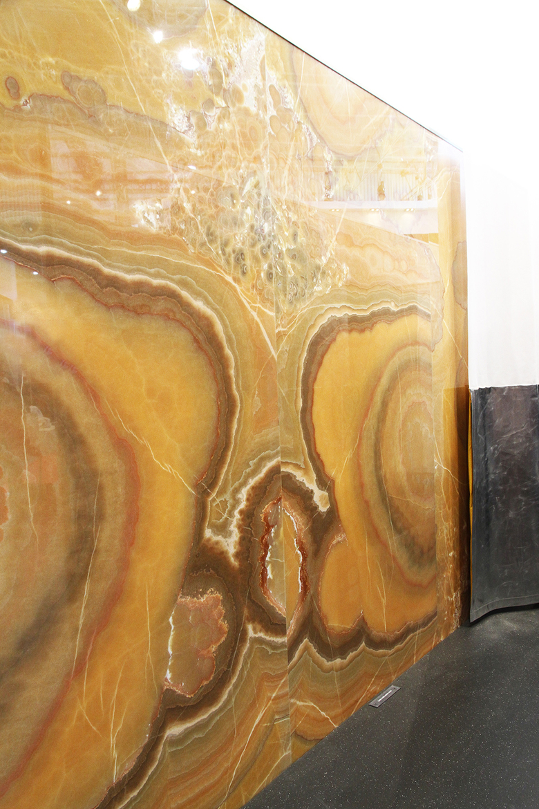 Face-to-face with large slabs of stone, visitors to the SolidNature "booth" at Maison & Objet easily grasp the colors, veining, variation and other qualities of the stones. Further, the reflections of the polished stones create a complex layering of stone, light and image, enhanced by the base of Blaisse's curtains, which consists of a reflective metallic fabric. Stone and fabric, architect and designer, work together toward a synthesis that is lush and slightly disorienting.