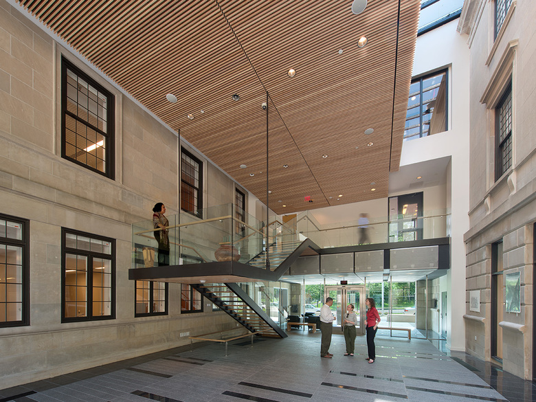 Consisting of the Ambassador’s Residence and the Chancery, built in 1936 and 1964 respectively, the Embassy faces Massachusetts Avenue NW, which is informally called "Embassy Row" in this stretch of Washington, D.C., due to the great number of embassies that line the diagonal street. The two buildings were linked by a breezeway at the second and third floors, its architecture following the style of its neighbors. Yet when it came time for Davis Brody Bond to carry out a major overhaul of the Embassy – providing for additional chancery functions, replacing existing building systems, and improving life safety measures – the tactic was different, more contemporary. The new infill piece served a few functions: adding more space, creating a new entrance, and literally and figuratively weaving together the old and new. The latter found material expression in the stainless steel mesh.