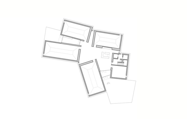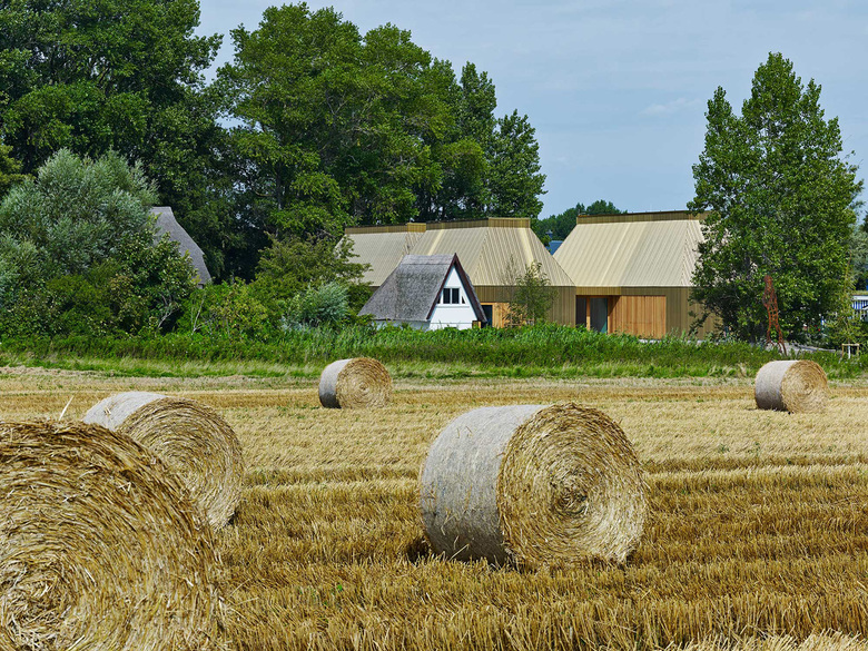 Taking a step back from the building allows us to see how the building's form and materials respond to the natural and constructed environment, what the architects call "a deep bond with the landscape and the historic building traditions of this region." The thatched-roof houses, often grouped together, were the main inspiration for Staab Architekten. The form, the continuous cladding of the walls and the hip roofs, and the way the five galleries huddle together (see plan at bottom), tap into this past. Additionally, the golden TECU® Brass covering appears to directly reference the agricultural landscape, although the material will patina over time to a green-brown finish that will merge the pavilions into the grass and trees.