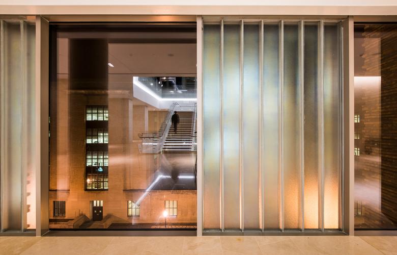 The glass features a translucent white ceramic frit, with many of the channels selectively fritted to provide a seamless transition from opaque to transparent. (Photo: Alex Fradkin)
