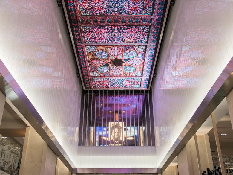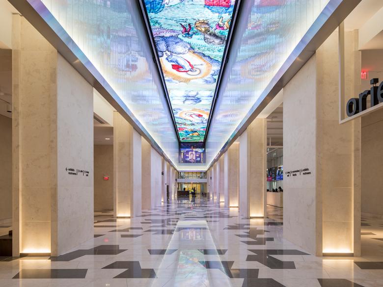 Looking toward the Museum’s entrance, Bendheim’s Clarissimo channel glass is used directly below the illuminated ceiling. (Photo: Alex Fradkin)