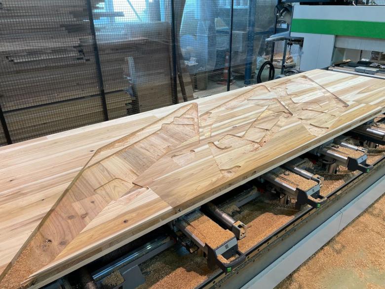 First, a block of CLT was machined into individual parts on a 5-axis CNC machine at VUILD's factory. (Photo: VUILD)
