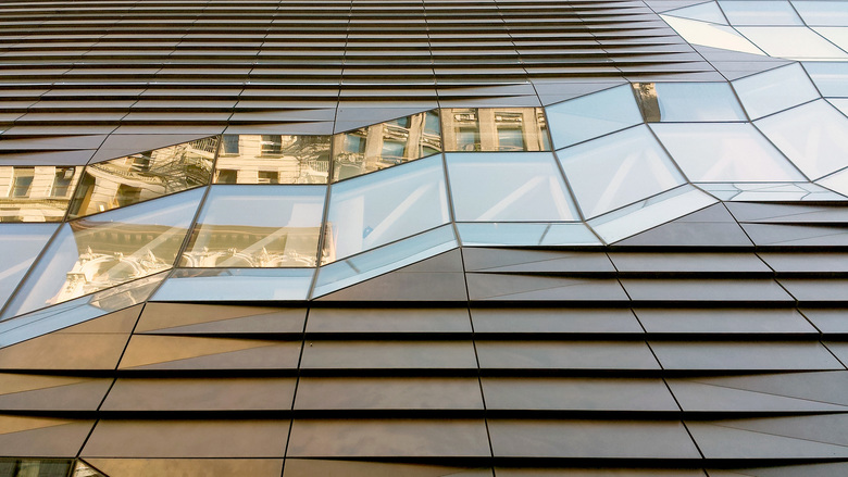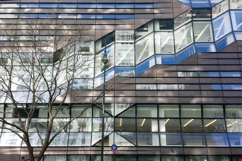 For the 131,000 square feet of brass on the exterior, SOM selected Muntz metal, CDA Alloy 203, a non-corrosive brass alloy typically used for shipbuilding, according to Metals in Construction magazine, which published a case study on the building in its Spring 2014 issue. The article also describes the zigzag path of the brass alloy, which was manufactured by Gamma North America: They carried out the design in Miami, where the aluminum panels for holding the brass shingles were produced; the brass panels were fabricated in Gamma's Quebec City location and then shipped to Toronto for a patina bath; finally they were sent to Miami to be made into unitized panels before making their way to the job site in New York. It was a long journey that paid off in a finished product that helps in creating a new symbol for The New School.