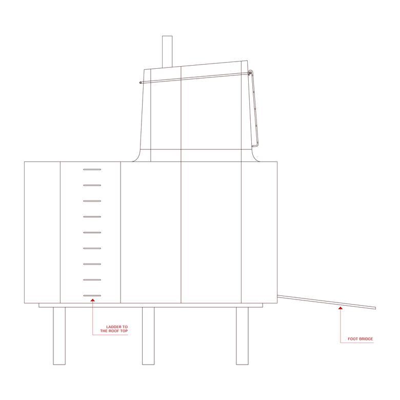 Due to the location of the bathroom module in a back-corner of the rectangular plan, the rear elevation, shown above, is glazed half as much as the front, with two sliding windows filling a 2.6-meter by 5.6-meter (8-1/2-foot by 18-foot) opening. Therefore half of the main level is visually open from front to back, and vice versa, and in suitable weather when the full-height windows are slid open the outdoors flows through the Vipp Shelter. Further, since the distance from the front facade to the rear facade is only 5.2 meters (17 feet), the shelter is well suited for cross-ventilation, particularly given the large size of the panes.