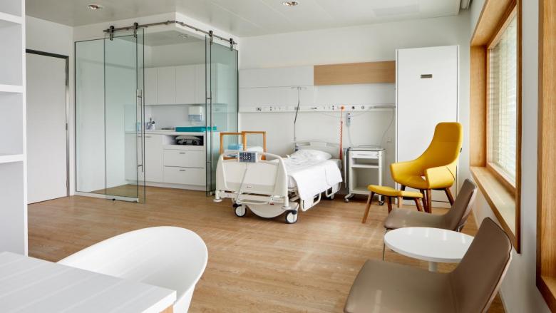 Patient room at the ‘AZ Zeno’ in Knokke-Heist, Belgium. Architecture: B2Ai (Photo: © Tarkett/Tim Fisher & Milosz Siebert)