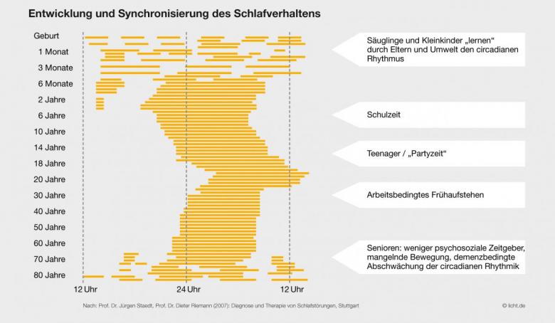 Development of sleep behavior: From birth to old age: sleep and wake phases during the day change over the years. (Graphic: licht.de)