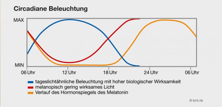 Circadian lighting: Daylight-like lighting with non-visual effects is only useful during the day (blue curve). At night, in the evening and early morning hours, biologically less effective light is appropriate. This prevents disruption of biological processes in the body, such as the evening increase in the hormone melatonin (orange). (Graphic: licht.de)