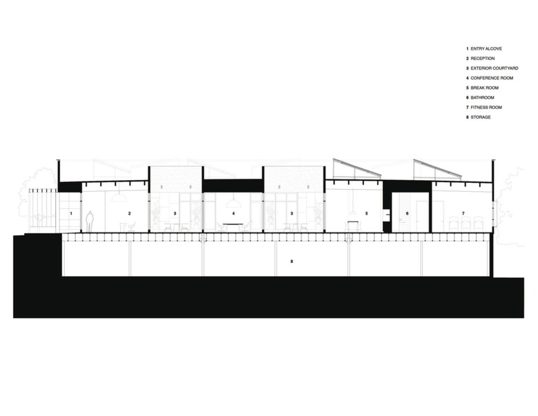 Building Section shows relationship of interior spaces to north and south exterior courtyards. (Drawing: Studio VARA)