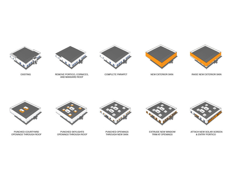 Architectural design for the building was driven by four main objectives: to embody the client’s enigmatic brand, to embrace the industrial aesthetic, to strategically introduce natural day-lighting through punctures in the envelope, and to execute the project efficiently via a well-detailed, judicious use of materials.