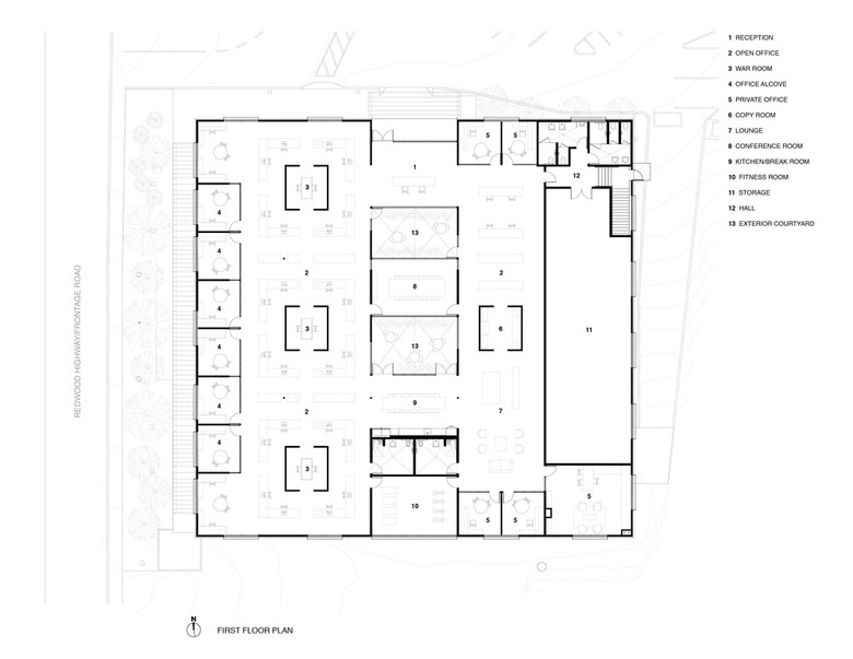 In response to the client’s desire for anonymity, the exterior presents a quietly ambiguous face to the nearby highway. A thin membrane of weathering corrugated steel wraps the exterior in understated boldness and is raised away from the dark stucco base to express its autonomy from the building. Deep window apertures are punctured through this skin and articulated by steel shadow boxes offset by dark black metal panels. The main entry is reoriented from the highway to the parking lot facade to underscore the higher degree of privacy the company requires and provide the confidentiality expected by much of their clientele.
