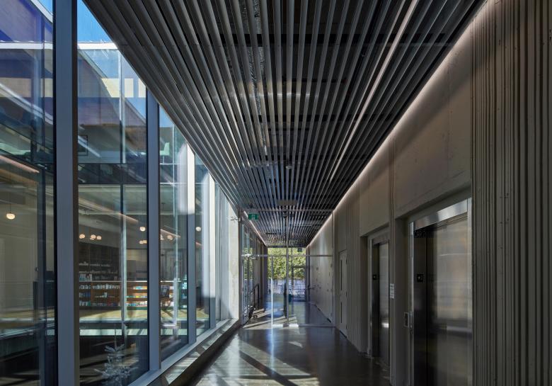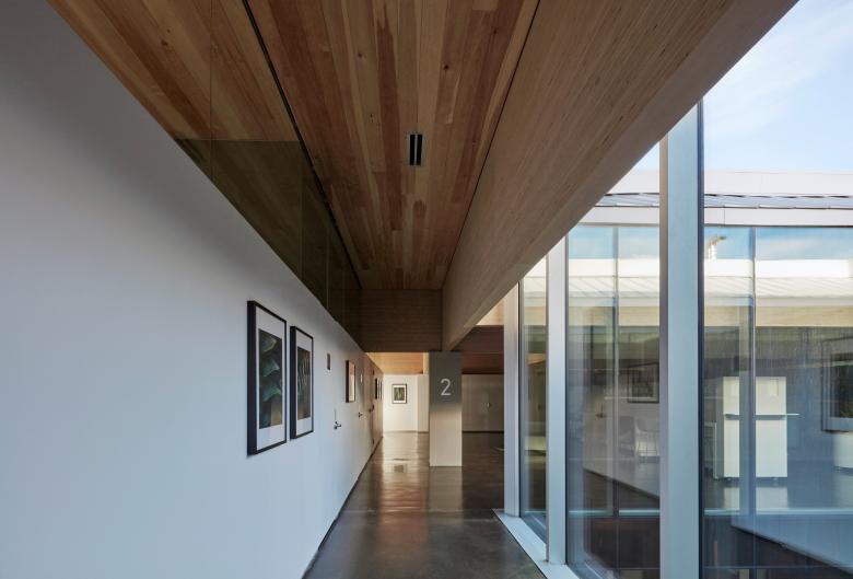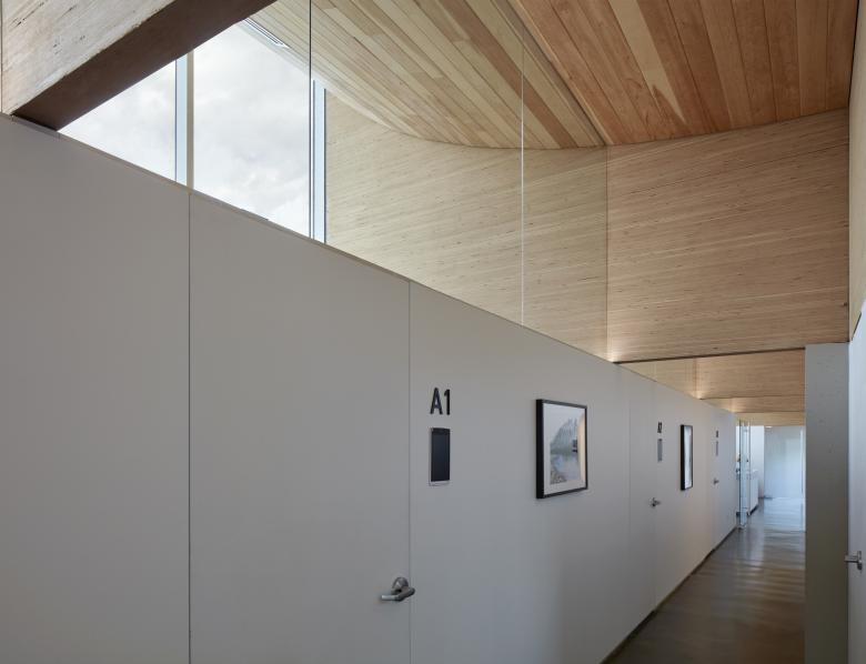 The light-filled spaces of the top floor are defined by an engineered vertical solid timber system that offers sound separation between rooms and solves a number of functional requirements: it acts as a roof structure that allows large spans and an uninterrupted floor plate, creates intimacy by way of rhythm of 7-foot thresholds, experienced each time one passes under the 'egg-crate' structure and, finally, provides a surface that diffuses light via natural material for a warm, tranquil glow. A high coffered ceiling, combined with the mechanical system and natural air convection, ensures that warm air remains in the ceiling space while conditioned air circulates in the bottom seven feet of the space occupied by patients and staff to promote focused and wakeful conditions.