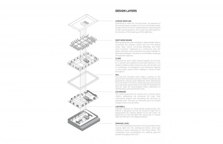 Requiring a significant amount of soft natural light for patient assessment and treatment, the dermatological clinic adopted multiple solutions that would generate an abundance of diffused light to embody the natural and healthy ethos that the centre represents. The arc of the wood ceiling also draws a wash of warm natural light to the interior from the roofline edge. Beacon’s multi-level courtyard allows sunlight to travel through the building core all the way to the parkade, transforming the building’s inner experience for visitors from the very first point of arrival.