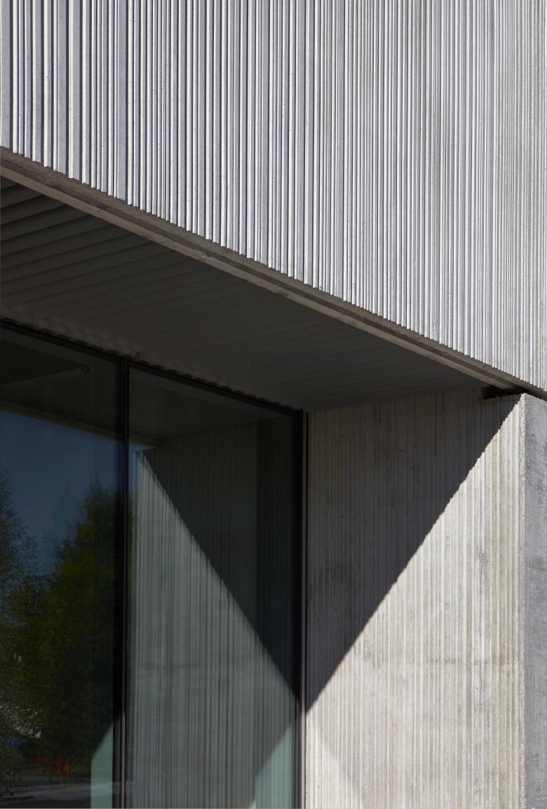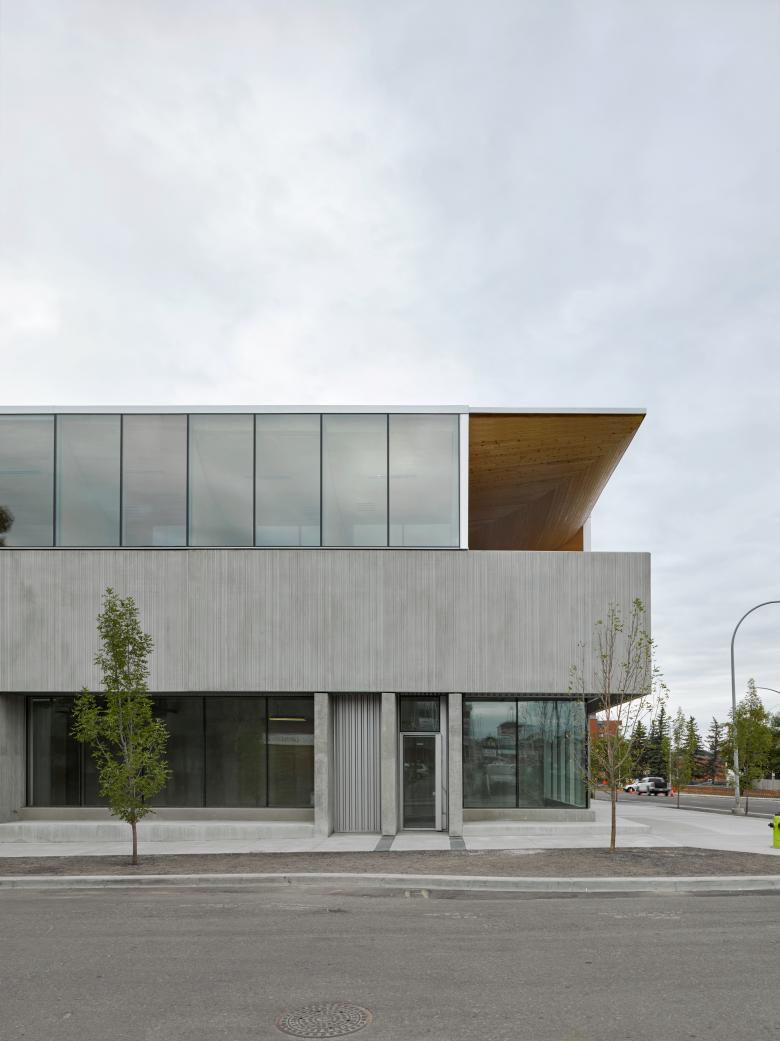 The concrete "veil" serves several purposes; initially imagined for privacy and a strong visual break, it is also an acoustic barrier from the street and an enclosure for building users. While giving the low profile of the two-story building the impression of a more spacious three-story mass, the veil preserves the interior functions of the space from public view. Its distinct appearance is informed by the needs of the building users and is a response to its exterior relationship with the street and contributing urban fabric.