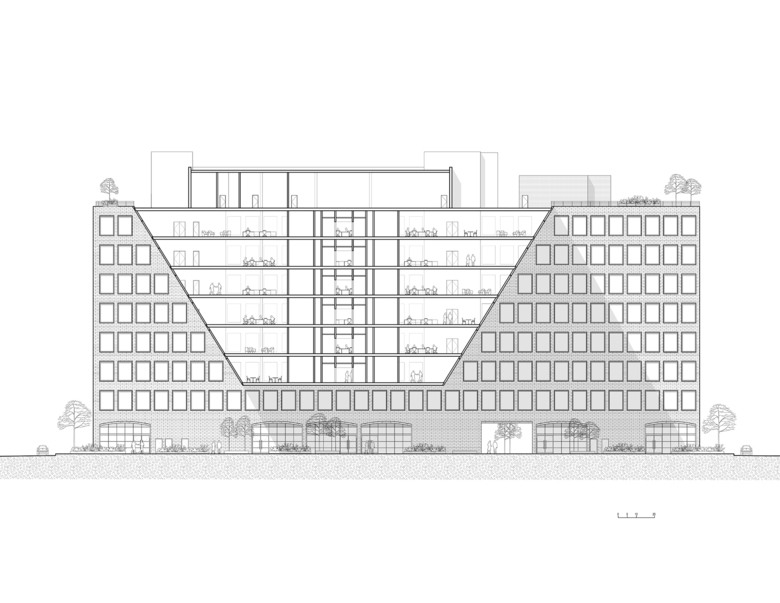 To create a bustling public core, a retail-lined pedestrian street goes straight through the building’s center. Bookended by landscaped plazas, the walkway will connect upcoming Bushwick Inlet Park with the nearby plaza of the William Vale hotel. What was once a forbidding industrial waterfront is now transformed into a walkable district of parks and public space. Ground-floor retail, including cafes and restaurants, activates the surrounding areas and provides social spaces where people can come together informally.